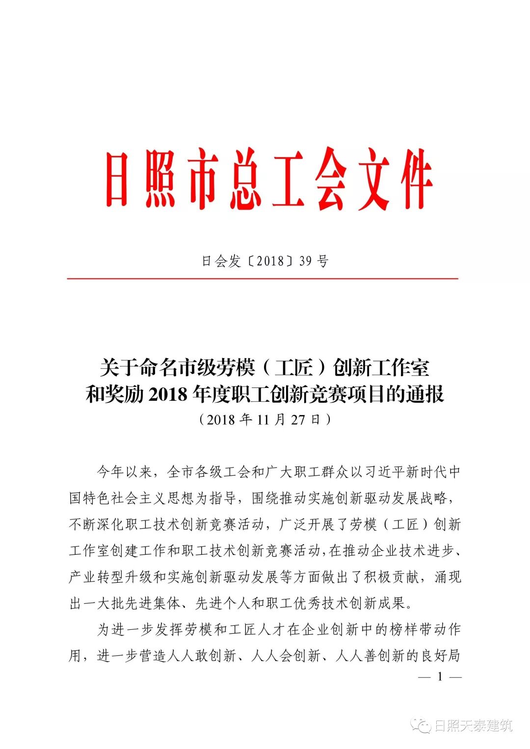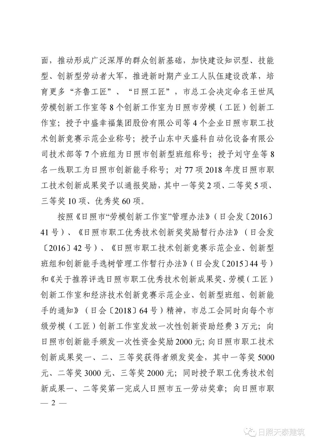 為進(jìn)一步發(fā)揮勞模和工匠工人才在企業(yè)創(chuàng)新中的榜樣帶動(dòng)作用,加快建設(shè)知識(shí)型、技能型、創(chuàng)新型勞動(dòng)者大軍,推進(jìn)新時(shí)期產(chǎn)業(yè)工人建設(shè)改革,培育更多“齊魯工匠”、“日照工匠”,日照市總工會(huì)對(duì)我市各工會(huì)2018年度日照市職工技術(shù)創(chuàng)新成果獎(jiǎng)予以通報(bào)獎(jiǎng)勵(lì),興業(yè)·天泰建筑公司的成果“新型安全配電箱”榮獲優(yōu)秀獎(jiǎng)。