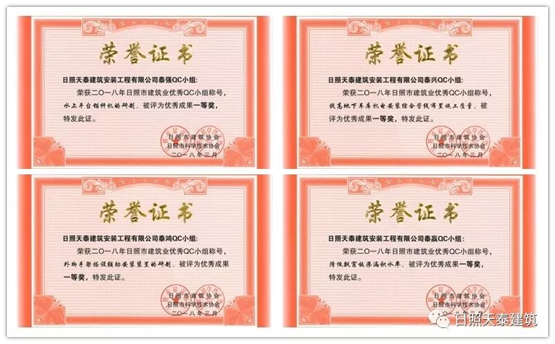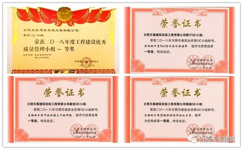 《新型懸挑腳手架接火斗研制》成果小組還獲得2018年度中國(guó)施工企業(yè)協(xié)會(huì)全國(guó)工程建設(shè)優(yōu)秀質(zhì)量管理小組一等獎(jiǎng)稱號(hào),成果獲得山東省建筑業(yè)優(yōu)秀QC小組成果、日照市優(yōu)秀成果一等獎(jiǎng)等榮譽(yù)稱號(hào),該成果已申請(qǐng)并獲得了國(guó)家實(shí)用新型專利,申報(bào)了省級(jí)工法并獲得山東省科技大賽三等獎(jiǎng)!